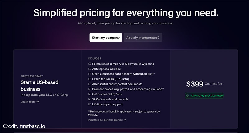- Firstbase Start – $399 one-time fee