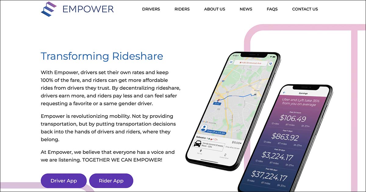 “Mission: Empower is on a mission to transform the ‘Gig Economy’ so that hard-working Americans can earn a sustainable living. To do that, Empower has built innovative software that allows drivers to set their own rates and get 100% of the fare. Empower’s software also provides riders with greater choice, enabling them to request a favorite or same-gender driver.