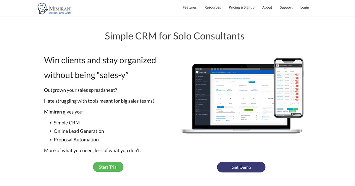 “Mimiran is a fun, ‘anti-CRM’ for independent consultants who love serving clients but hate ‘selling.’ Traditional CRMs help VPs of sales keep track of sales reps. But if you’re an independent consultant, you’re the VP of sales, the sales rep, the CMO, CFO, consultant, and more. So you need a CRM that helps you grow and nurture your network, does a bunch of work for you, and stays out of your way.”